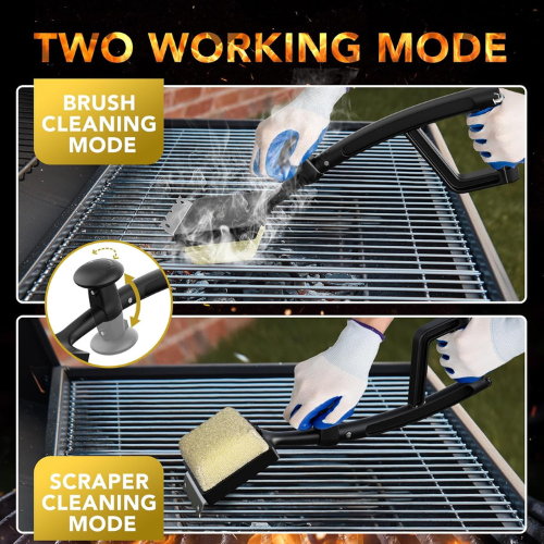 - Adjustable handle with Open/Lock knob and stainless steel scraper provides better leverage, reduced wrist strain, and easy access to every corner of the grill
