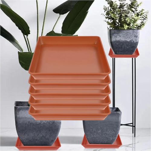 - Square design fits neatly under pots to catch runoff and keep roots hydrated