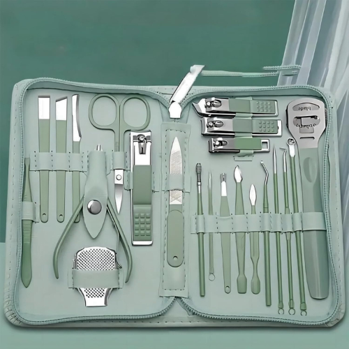 - The professional manicure and beauty kit offers 22 care tools for hands, feet, and face, providing a more economical option than separate purchases. It comes with a green zipper leather bag for easy portability, making it suitable for various locations.