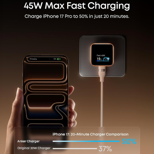 - 45W Max Fast Charging: Provides high-speed charging up to 45W with smart power adjustment, capable of charging an iPhone 17 Pro to 50% in 20 minutes.