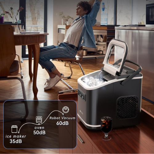 - Featuring a convenient carry handle and a sleek, space-saving frame, this quiet ice maker is a “pocket-sized marvel” ideal for kitchens, RVs, office bars, or camping trips.