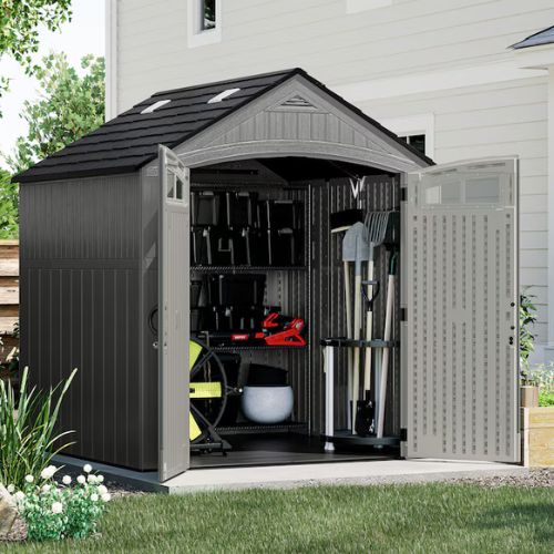 Hop over to Lowe’s and maximize your outdoor storage with the 7×7 Feet CRAFTSMAN Gable Roof Storage Shed. With 327 cu. ft. of space, it’s perfect for organizing gardening tools, bicycles, lawn equipment, and more. Compatible with the Versa Track™ system, you can add shelves and hooks for even more storage. Sturdy double doors with metal hinges provide easy access, and a pad-lockable metal hasp keeps your belongings secure (lock not included). Built with metal-reinforced, multi-wall resin panels and flooring, this shed offers durability, stability, and protection from the elements.
