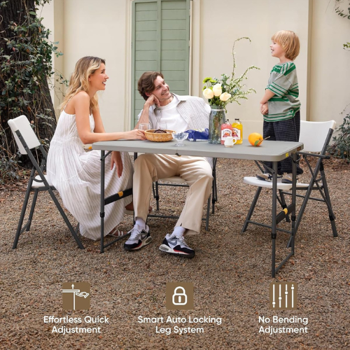Effortlessly adjust to your needs or tasks. This FAB Rated Height Adjustable 4Ft Folding Table requires no assembly; simply lift or press a button for height adjustment. It features an auto-fixing lock for safety, preventing finger pinches, and offers four height settings (22”, 24”, 29”, 34”). Ideal for various indoor and outdoor activities, it is made from durable HDPE and has steel legs for stability. Designed for portability, it includes side locks and a carry handle for easy transport, easily storing under beds or in car trunks. Right now you can snag this for as low as $59.99 when you use the coupon code 7WUIDJ9O (Work for All). Through 04/30/26 or while supplies last.