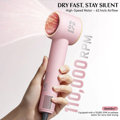 Style with comfort, safety, and ease. Fanttik Solo SonicDry Hair Dryer features a motor that operates at 110,000 RPM, producing airflow up to 65 m/s for drying hair in just 3–5 minutes, making it 5X faster than traditional models. It operates quietly at 56 dB, thanks to Softonic technology, providing a peaceful experience for users. At only 0.72 lbs, it is 17% lighter and designed for portability, making it easy to travel with. The dryer utilizes 300M ions for static neutralization and has a thermal guard that checks temperature 1000 times per second to prevent heat damage. It also includes a magnetic filter for safety and an instant-cool button to set your look, without excessive heat damage. Right now you can snag this for as low as $69.99 when you use the coupon code PWYPLCW7. Through 02/15/26 or while supplies last.
