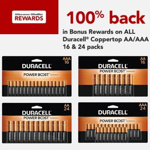 - Earn 100% back in Office Depot Rewards on select Duracell battery packs