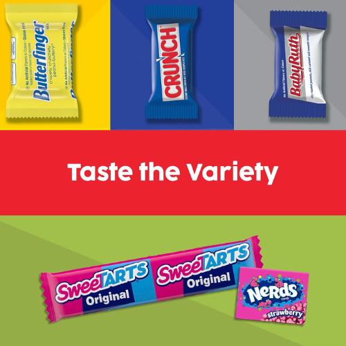 - This monster-sized bulk bag features an impressive assortment of individually wrapped Butterfinger, CRUNCH, Baby Ruth, Nerds, and SweetTarts, providing a perfect blend of chocolatey, nutty, and fruity treats.