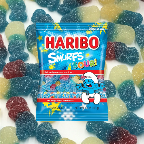 - The product features Sour Smurfs Gummi Candy, offering a fun and tangy treat.