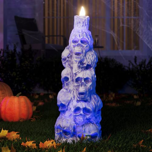- This 3-FT lighted skull stack with flickering yellow flame and color changing body will create a perfect ambience for porch or living room