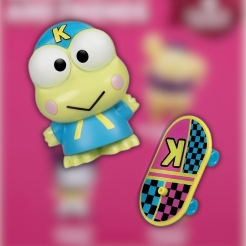 • This 4-inch Keroppi figure features a trendy hoodie and “K” hat while posing on a custom, checkered skateboard.