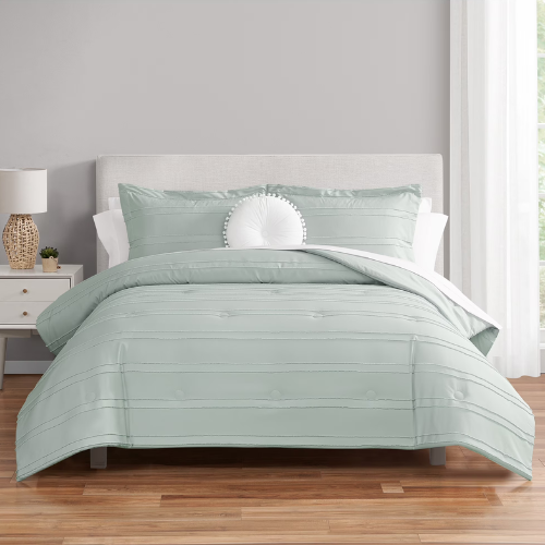 Hop over to Walmart and get a deal on this FAB Rated Mainstays Bed in a Bag Comforter and Sheets Set. This all-in-one unisex, adult bedding set includes a comforter, matching pillow shams, a coordinating sheet set with not 2 BUT 4 pillowcases and one decor pillow. The comforter and sham feature a textured stripe in soft sage color reminiscent of calm and tranquility, also includes a white crisp white sheet set and round elegant, tufted color velour pillow embellished with pompoms. You can get this in either Full Size, Queen Size, or King Size. Available colors include Mint, Blush Pink, and Navy Windowpane.