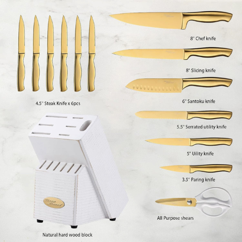 A comprehensive set to joyfully prepare your next meal. Marco Almond 14 Piece Kitchen Knife Set features premium German stainless steel for professional-level sharpness and ease of use. The attractive design includes gold-toned knives paired with a white block, enhancing kitchen aesthetics while ensuring organization. The stainless steel provides corrosion resistance, and titanium contributes to non-stick properties suitable for frequent or prolonged use. Each knife is a single piece with optimized weight and balance for comfort and grip. This versatile knife set caters to both professional chefs and beginners, including an 8″ chef knife, an 8″ slicing knife, a 6″ santoku knife, a 5.5″ serrated utility knife, a 5″ fine edge utility knife, a 3.5″ paring knife, kitchen shears, 6 serrated steak knives, and a wooden knife block for safe storage. The set is backed by a one-year warranty and is suitable for various gifting occasions, making it a practical choice for families. Right now get a Black Friday Deal on this for only $56.99. Through 12/01/25 or while supplies last.