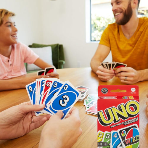 - When down to one card, players don’t want to forget to yell ‘UNO!’ Keep score and the first player or team to 500 wins!