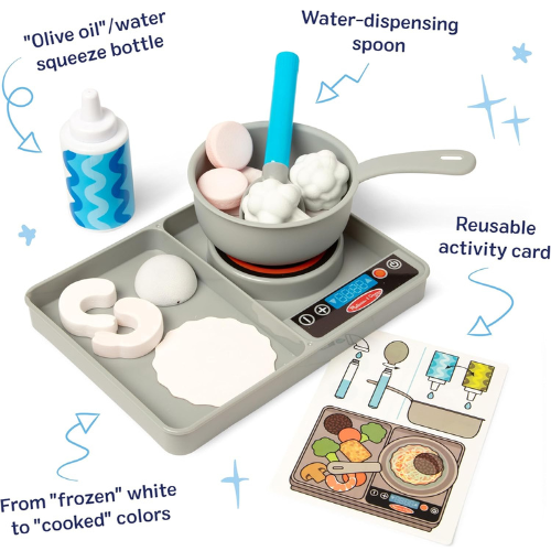 - “Cook” with water again and again with color-changing play food and stovetop play set
