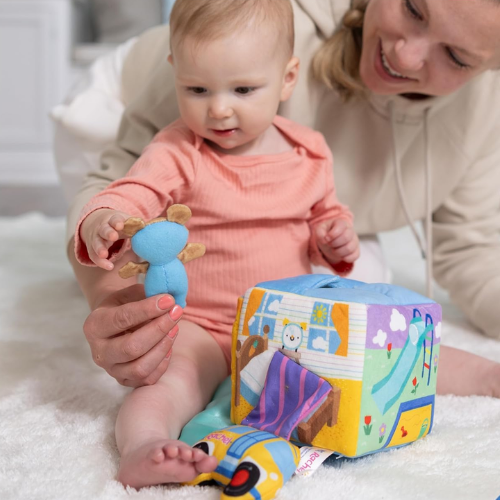 - The peek-a-boo lift-the-flap design encourages grasp and fine motor skills, while pulling out surprises helps build communication skills through phrases like, “What’s in the box, what could it be?”