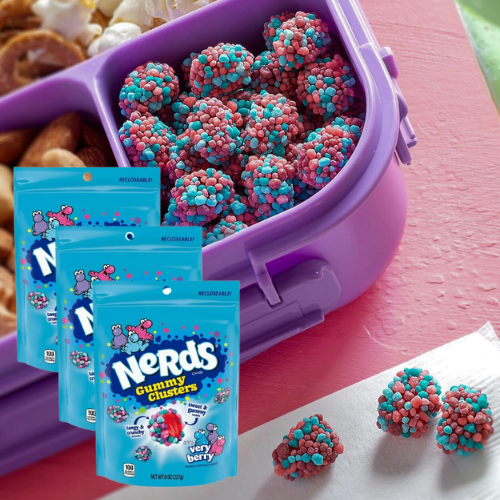 - NERDS GUMMY CLUSTERS: Classic, crunchy NERDS candies heaped on a red gummy candy center to make tasty snackable pieces too fun for words