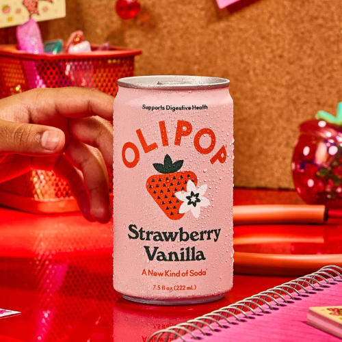 - 6 mini cans (7.5 oz each) of OLIPOP Strawberry Vanilla with a creamy strawberry-vanilla soda taste