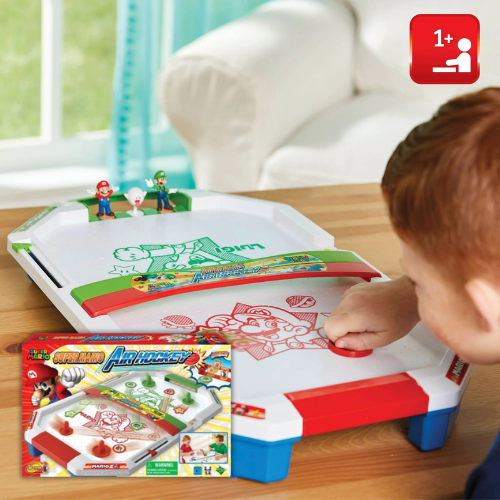 - This easy-to-assemble tabletop platform comes fully loaded with four paddles in varying sizes, six unique pucks in three different shapes, and three iconic character plates to bring the Mushroom Kingdom to life.