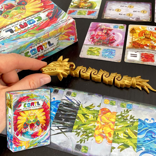 - Featuring stunning illustrations inspired by Aztec history and Nahuatl motifs, this edition includes “The Golden Snake” components which are fully compatible with the original Cóatl base game.