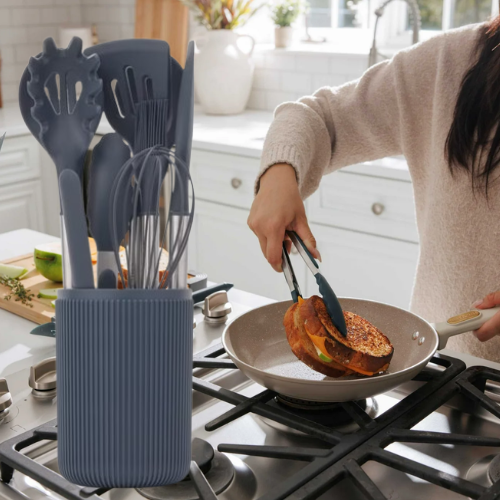 - This all-in-one set equips your kitchen with every essential tool—from spatulas and ladles to a pasta server and whisk—neatly organized in a matching countertop holder.