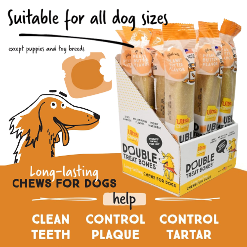 - Promotes Good Dental Health – Ultra Chewy Double Treat Bones satisfy dogs’ natural chewing instinct and promote dental health by reducing plaque and tartar, leading to fresher breath and a healthier mouth.