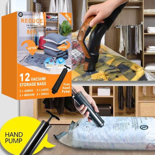 Hop over to Amazon and get a deal on Vacuum Storage Bags With Pump, 12-Pack Various Sizes. These reusable vacuum storage bags help reduce the size of blankets, comforters, clothes, pillows, and more for efficient organization. Compatible with any standard vacuum cleaner, simply place items inside, zip the bag closed, and remove the air to compress. The set includes 12 bags in four sizes—3 jumbo (40 × 30 in), 3 large (32 × 24 in), 3 medium (28 × 20 in), and 3 small (24 × 16 in)—along with a convenient travel pump for added versatility. If you want a same-size set you can check the Large Vacuum Compression Bags, 5-Pack
