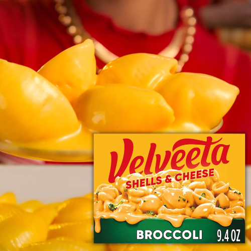 - Contains a 9.4 oz box of Velveeta Shells & Cheese Broccoli, featuring shell pasta, cheese sauce, and broccoli florets