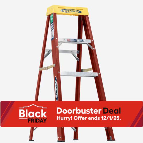 Hop over to Lowe’s and get a Black Friday deal on Werner 4-ft Fiberglass Step Ladder. It offers a 2-step design that features a convenient ladder top for quick and easy access to tools while you work. Its non-conductive fiberglass rails offer a safe choice for working around electricity, while the durable aluminum rungs provide secure footing when climbing. Designed for safety and stability, it also features slip-resistant Traction-Tred steps and slip-resistant molded foot pads, keeping the ladder secure on a variety of projects, from painting or hanging curtains to renovations and more.