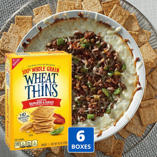 - Six 8.5 oz boxes of Wheat Thins Sundried Tomato & Basil Snacks, Whole Grain Wheat Crackers (packaging may vary)