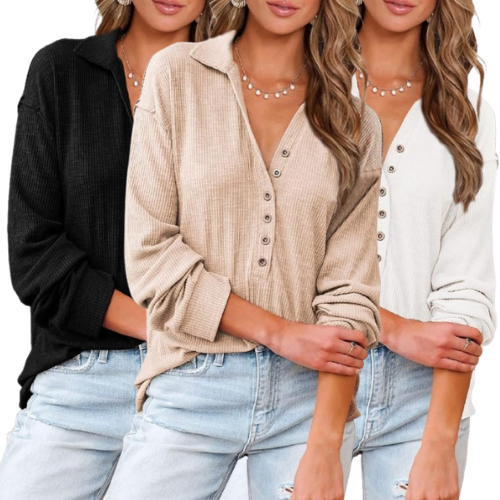 - Loose fit, long-sleeve fashion tops for women featuring a button-up design and classic V-neck with a stand collar. Includes popular ribbed knitted details at cuffs, two functional and four decorative buttons.