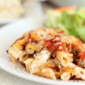 Layer a 9x13 pan (or two 8x8 pans) with half of the pasta mixture, meat, and pasta sauce. Repeat. Add shredded cheese on top. (See below for freezer instructions.) Bake uncovered for about 30 minutes, until warmed through.